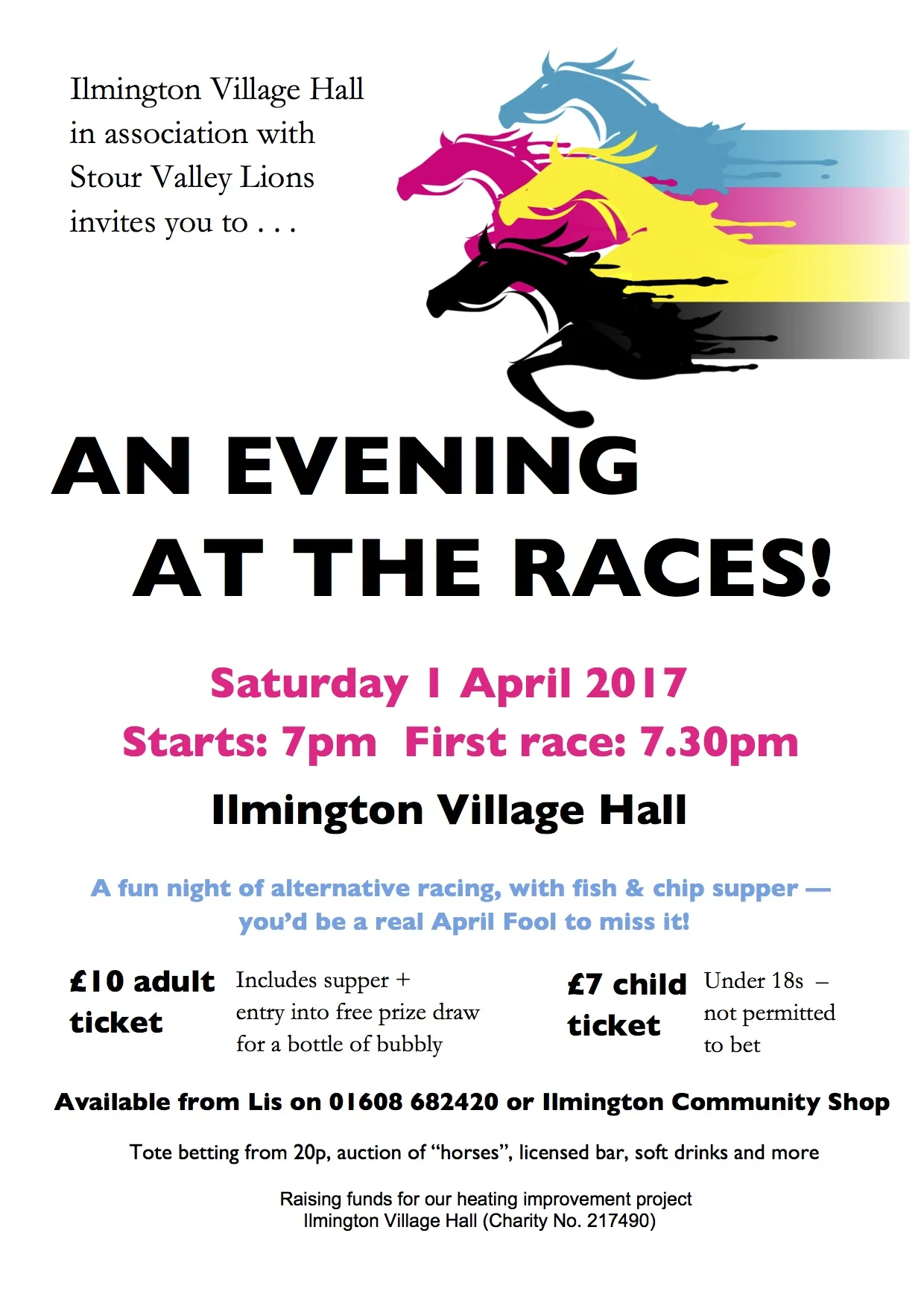 Join us for an evening at the races on Saturday 1 April at llmington Village Hall. Kindly hosted by Stour Valley Lions, Race Night is always popular and great fun, with races held on the flat and over the jumps.